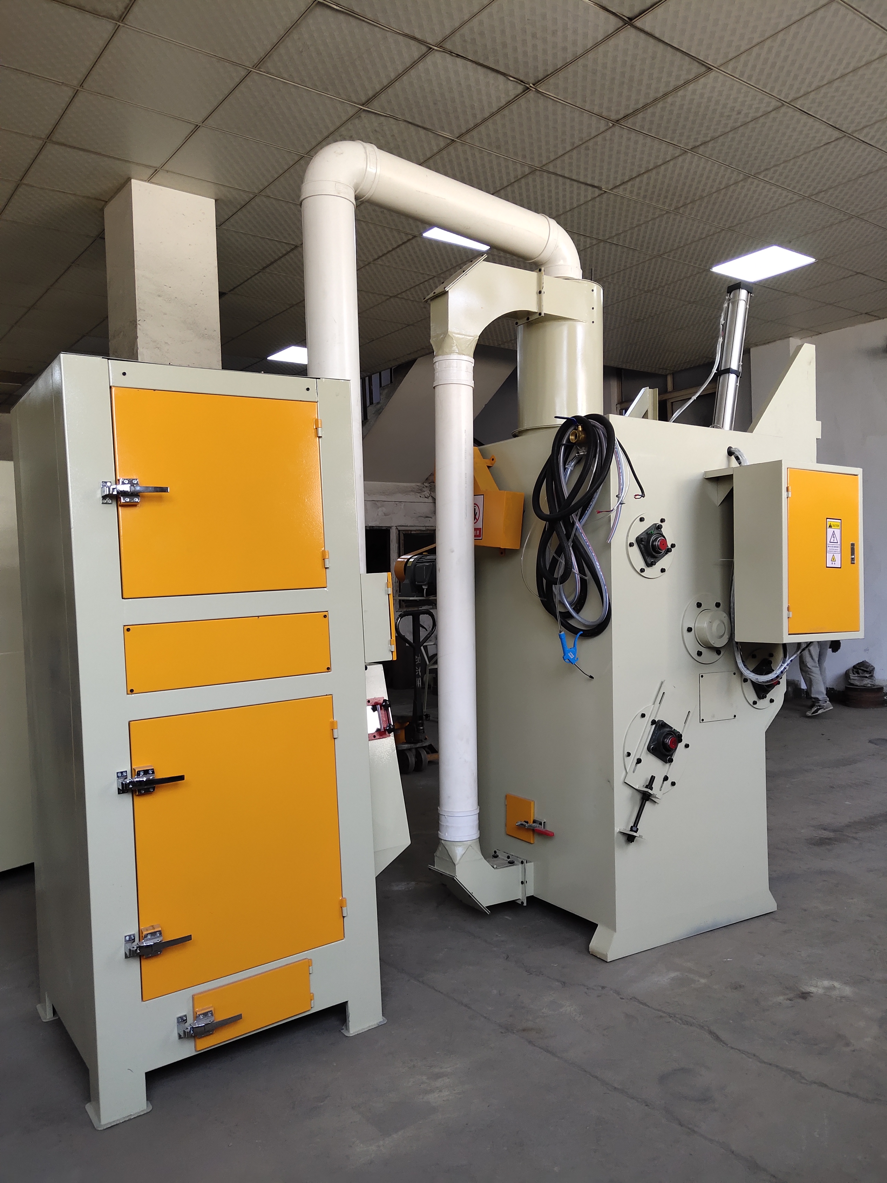 1、本機(jī)采用履帶帶動(dòng)工件翻轉(zhuǎn)滾動(dòng)從而實(shí)現(xiàn)全方位噴砂作業(yè)的加工方式;